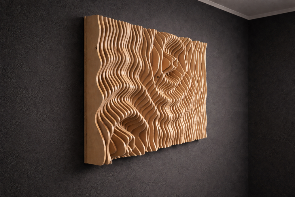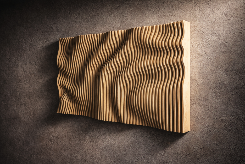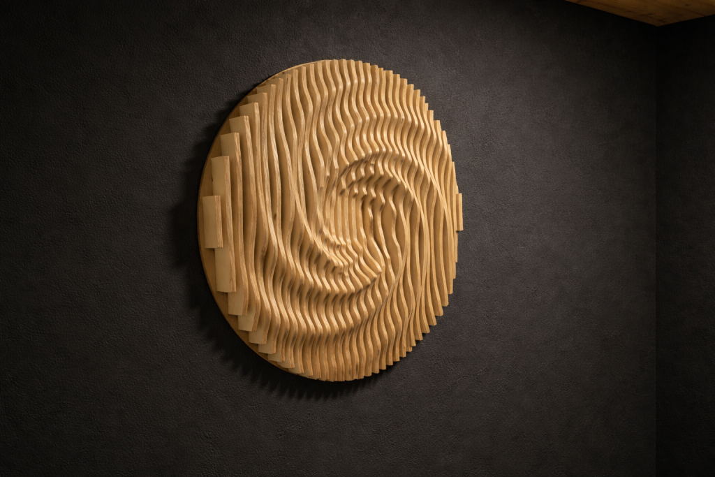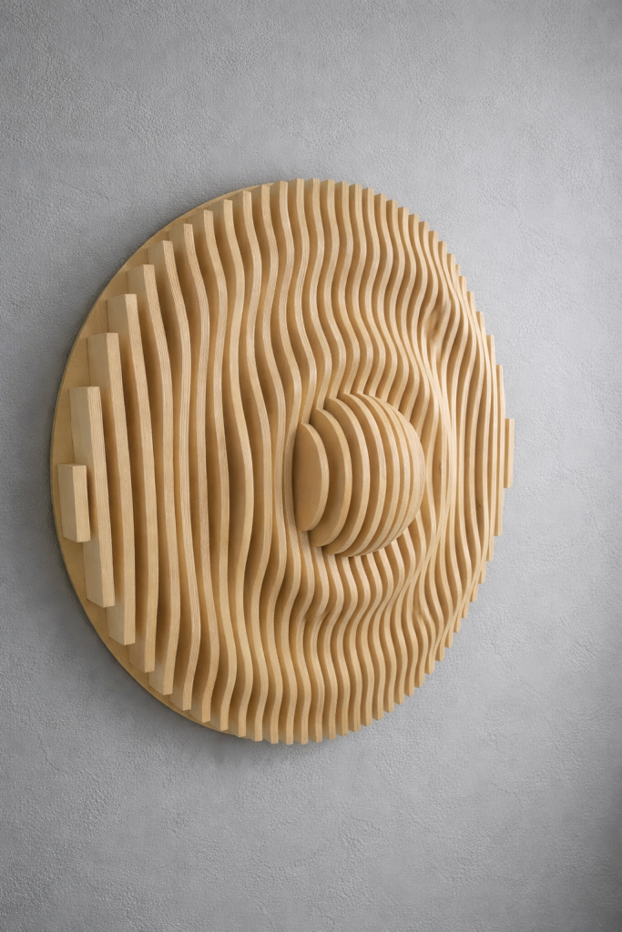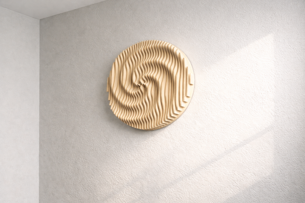 Aalto & Pisara tuo tilaan syvyyttä ja rytmiä: aaltoileva pinta ja pisaramaiset muodot piirtävät seinälle varjoja, jotka elävät valon mukana. Valitse valmis malli, koko ja pintakäsittely – tai toteutetaan teos mitoillesi. Mukana seuraa akustinen vaikutus.