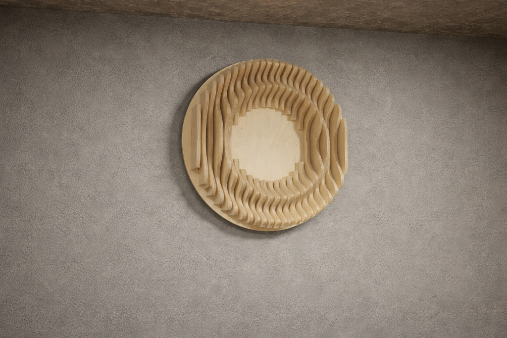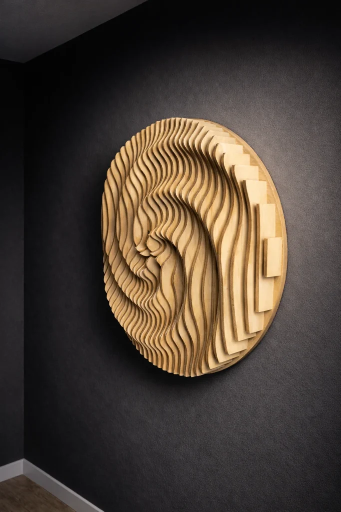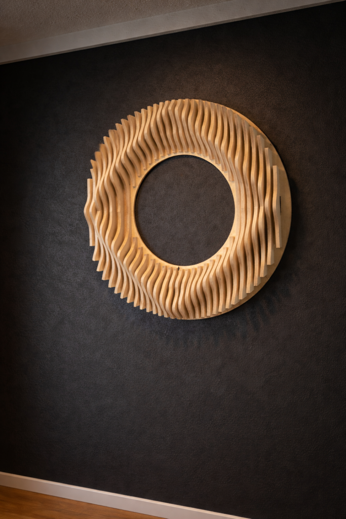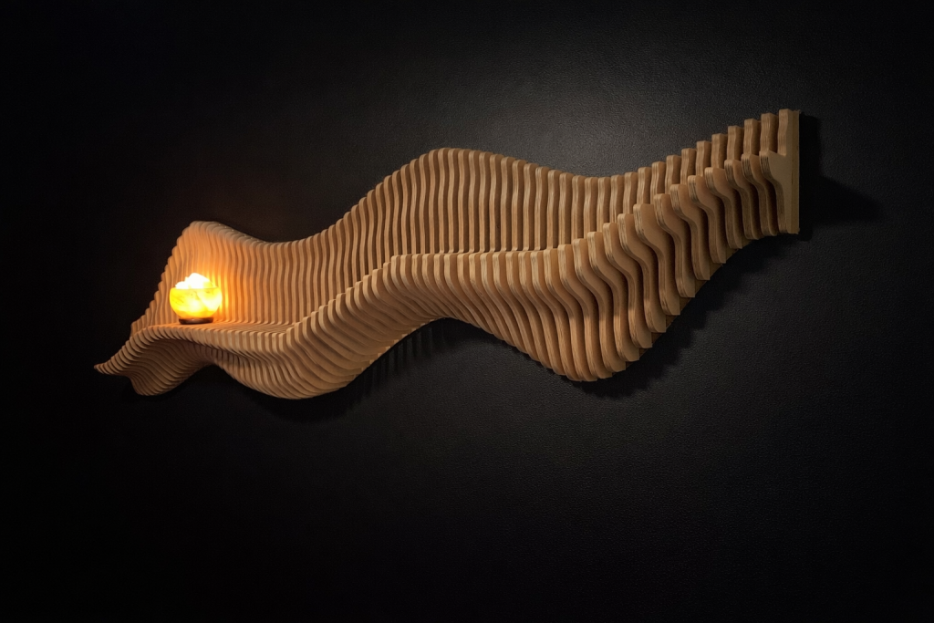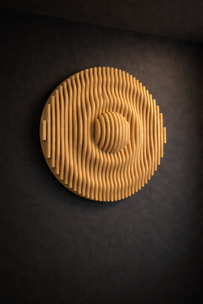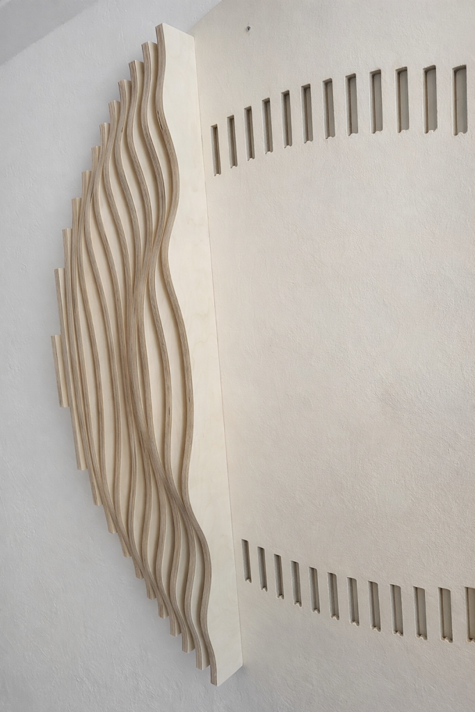 Aalto & Pisara tuo tilaan syvyyttä ja rytmiä: aaltoileva pinta ja pisaramaiset muodot piirtävät seinälle varjoja, jotka elävät valon mukana. Valitse valmis malli, koko ja pintakäsittely – tai toteutetaan teos mitoillesi. Mukana seuraa akustinen vaikutus.