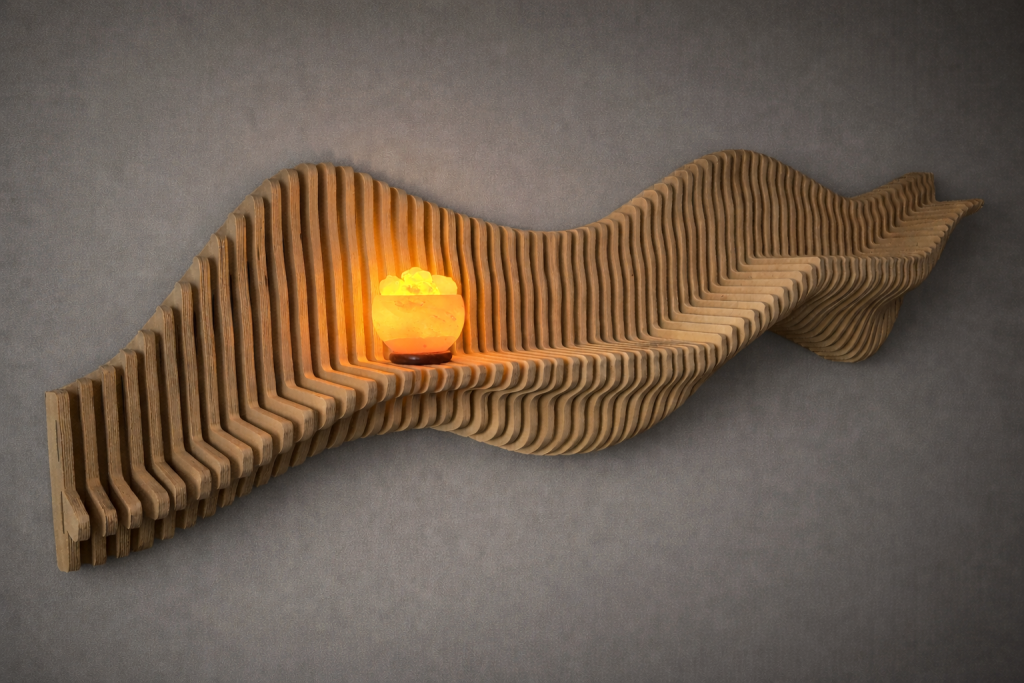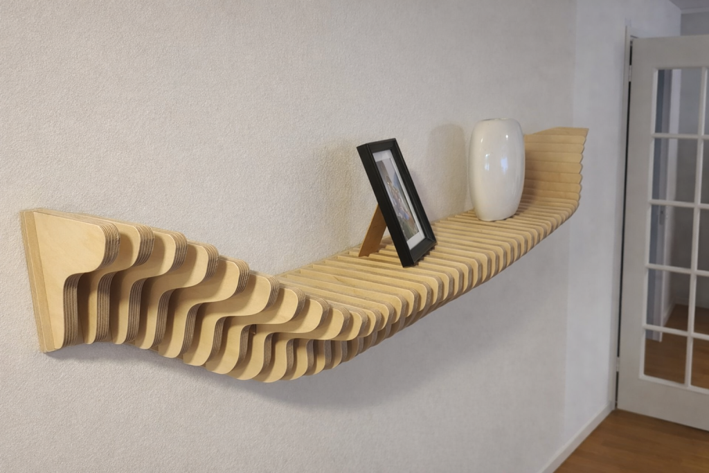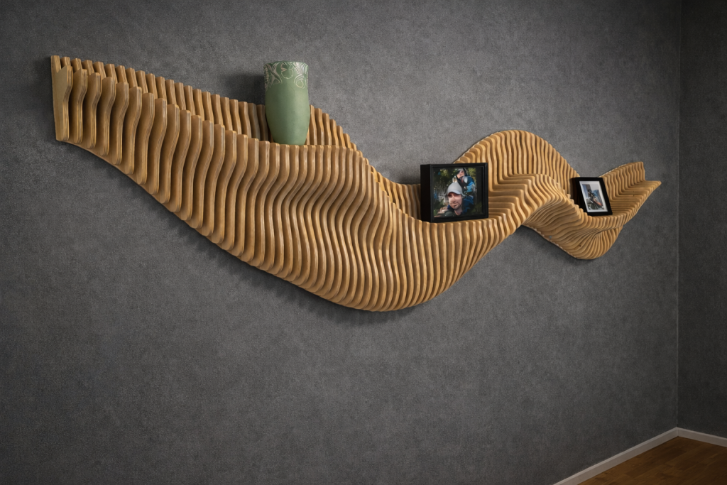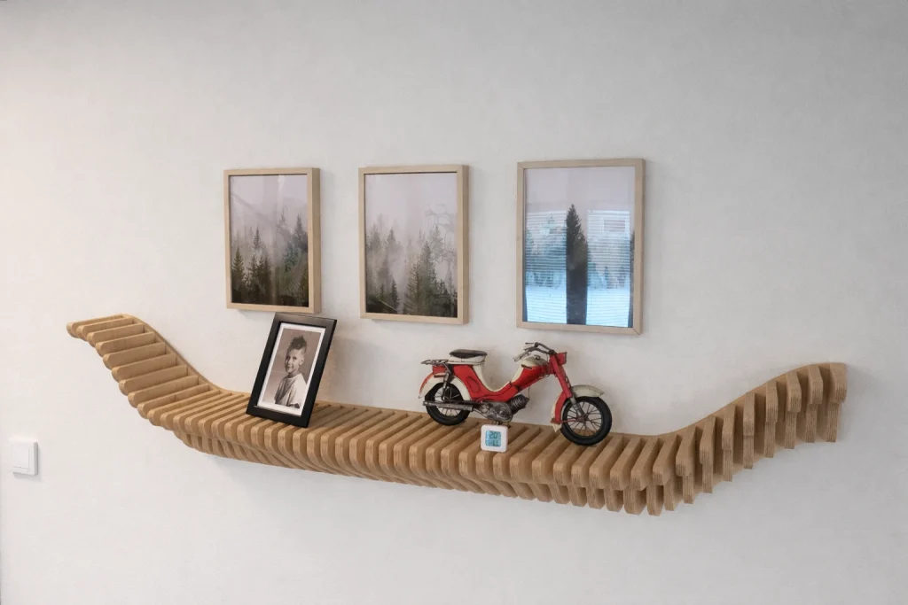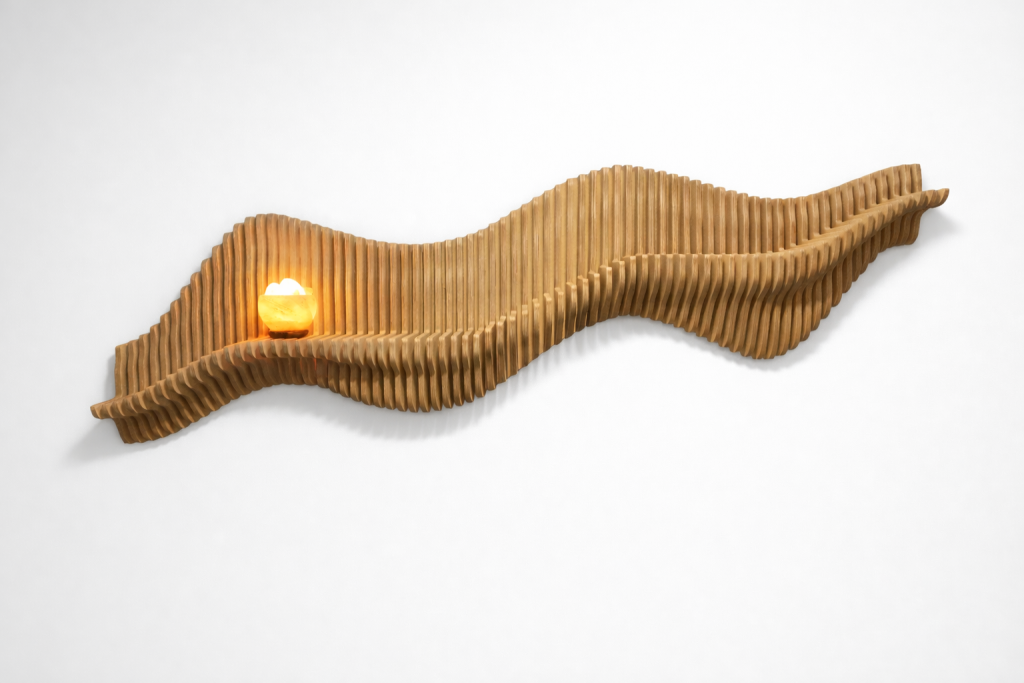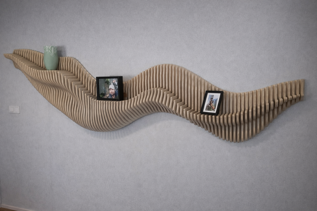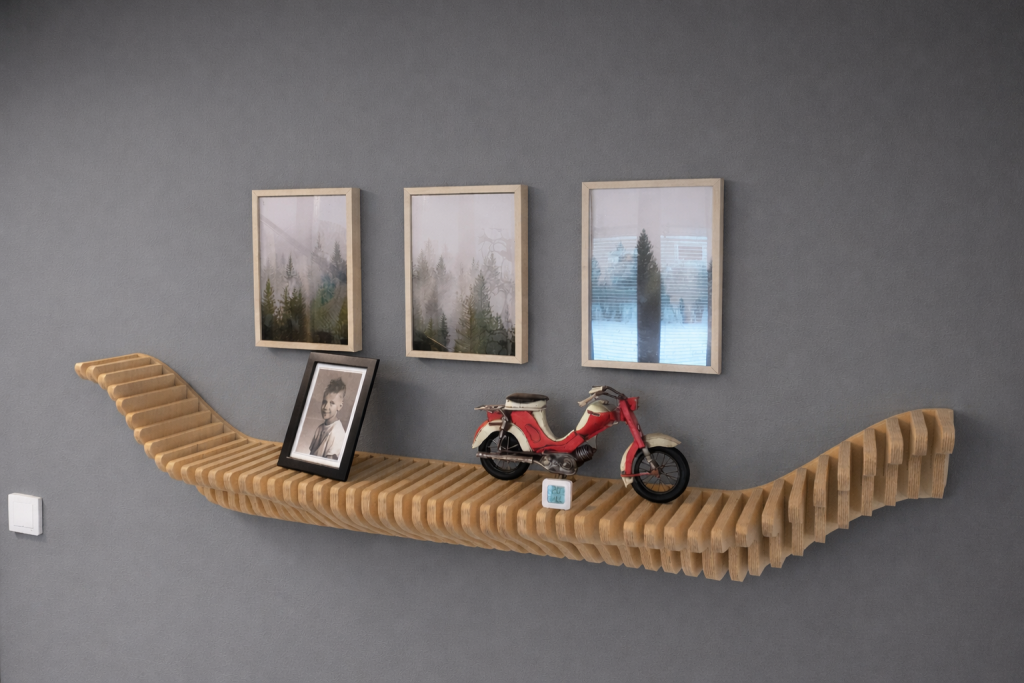 Audiocheckin Aaltohylly on seinälle muodostuva taideteos, joka toimii samalla pienten esineiden esilläpitäjänä. Aaltoileva muoto nostaa valokuvat, kukkaruukut ja muut yksityiskohdat kauniisti esiin ja piirtää tilaan valon ja varjon rytmiä. Valitse valmis malli, koko ja pintakäsittely – tai toteutetaan hylly mitoillesi.