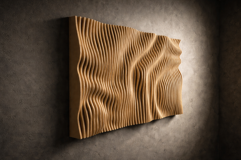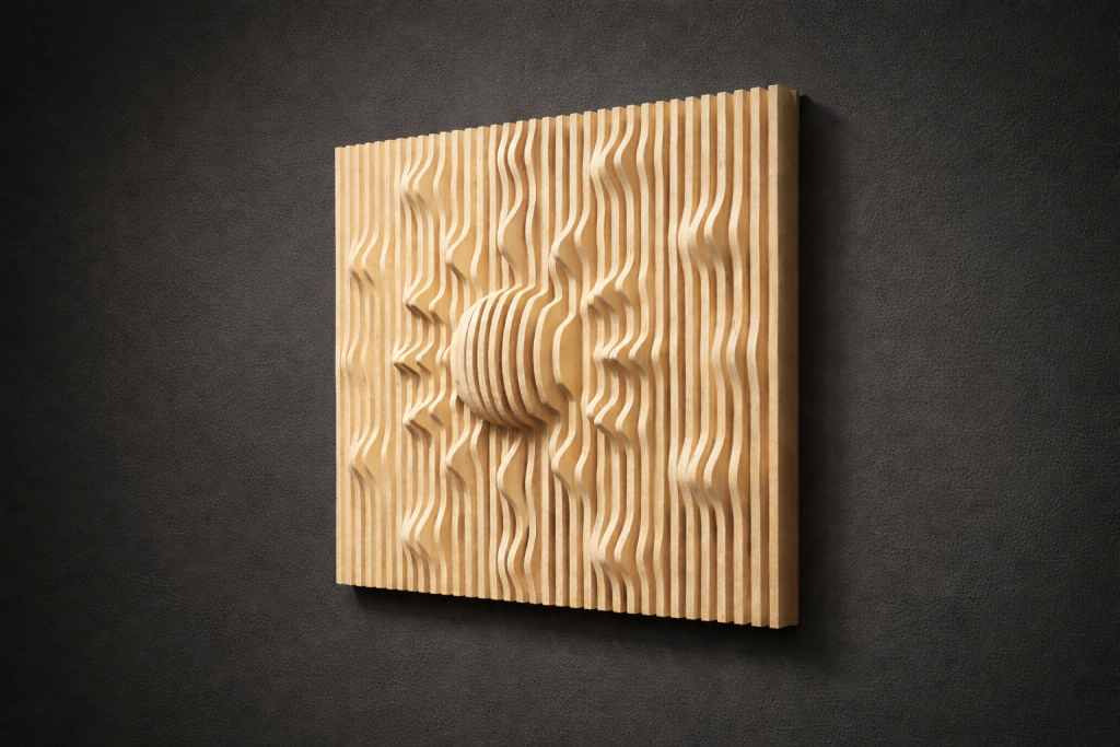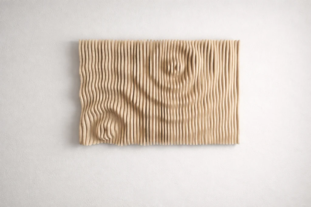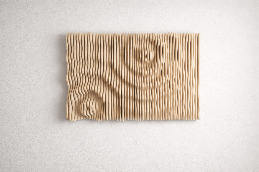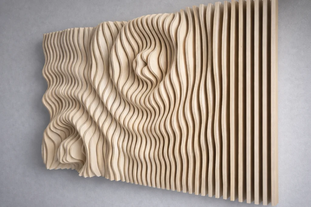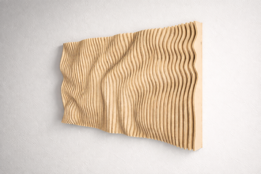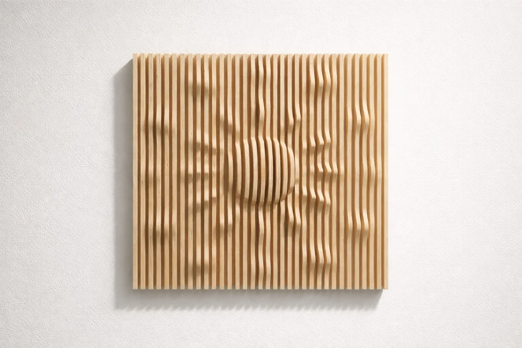 Muodon, valon ja varjojen veistämä seinäteos tekee tilasta kiinnostavan – ja toimii samalla akustisena elementtinä. Valitse valmis malli tai toteutetaan teos sinun mittojen ja pintakäsittelyn mukaan.