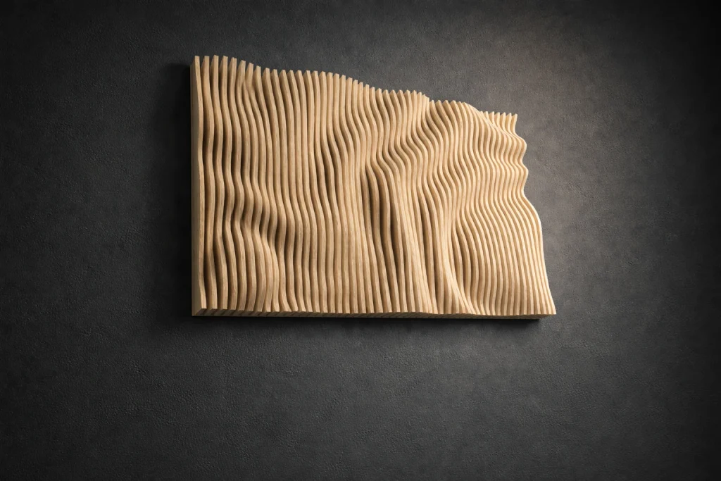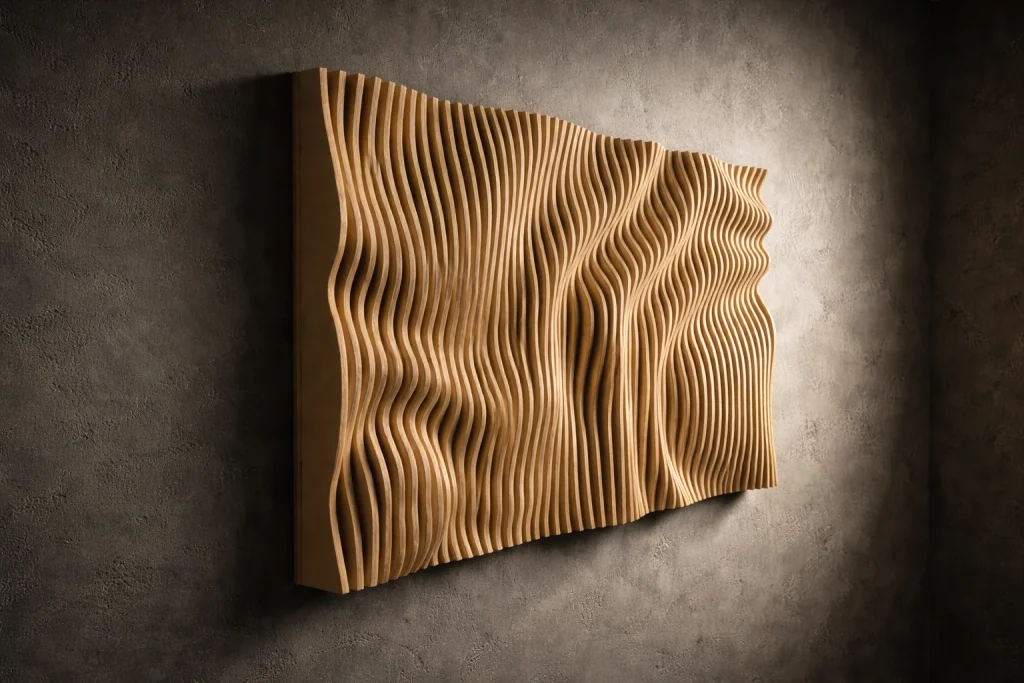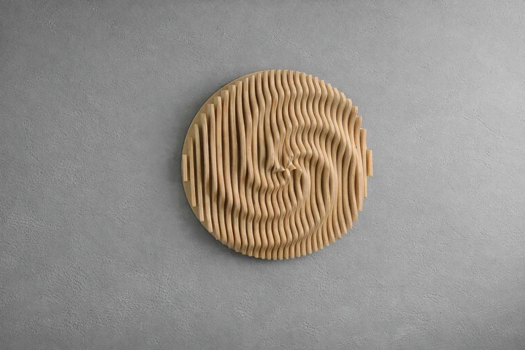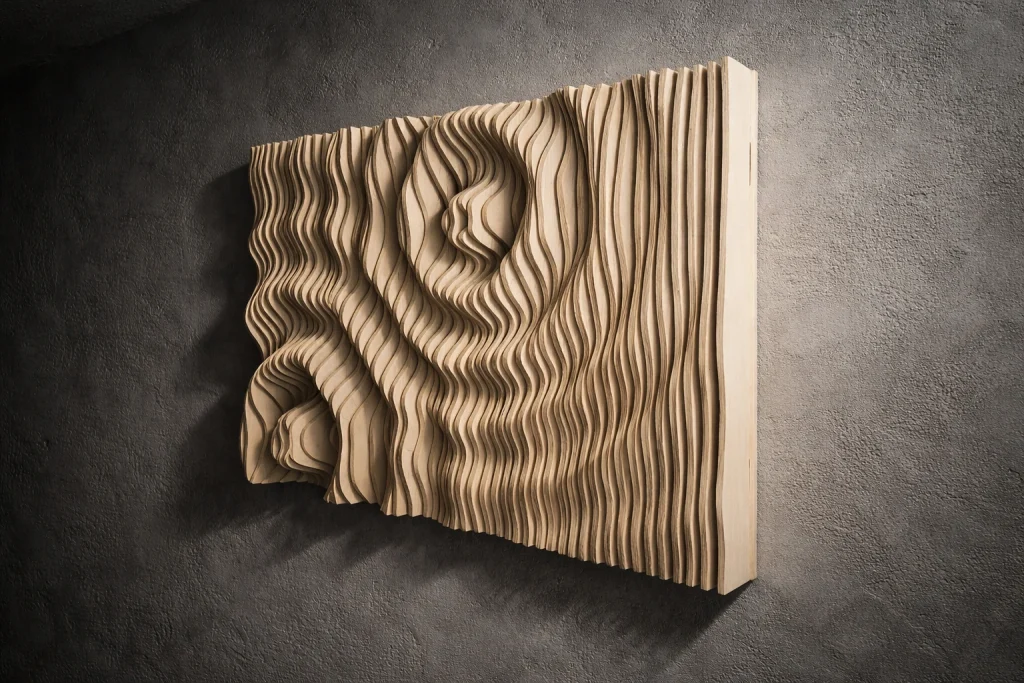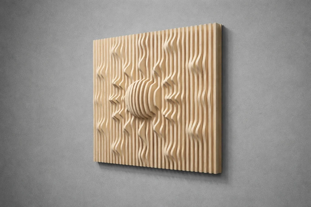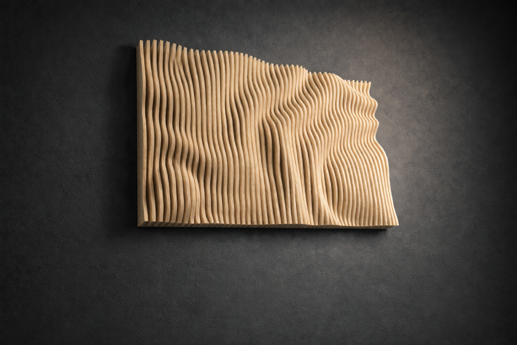 Muodon, valon ja varjojen veistämä seinäteos tekee tilasta kiinnostavan – ja toimii samalla akustisena elementtinä. Valitse valmis malli tai toteutetaan teos sinun mittojen ja pintakäsittelyn mukaan.