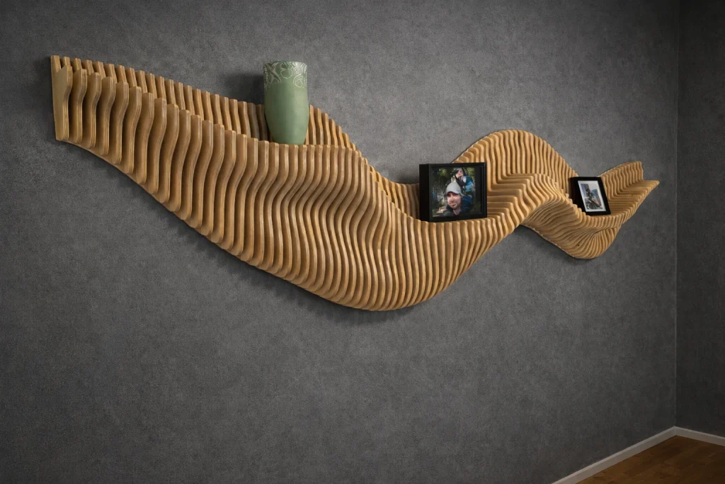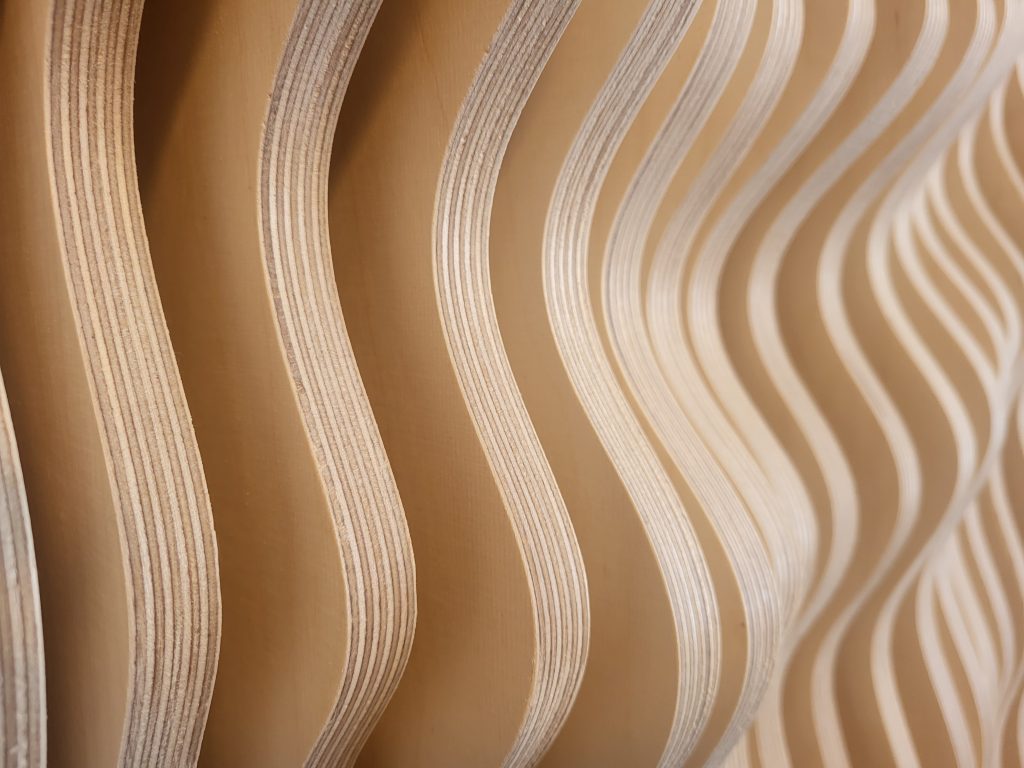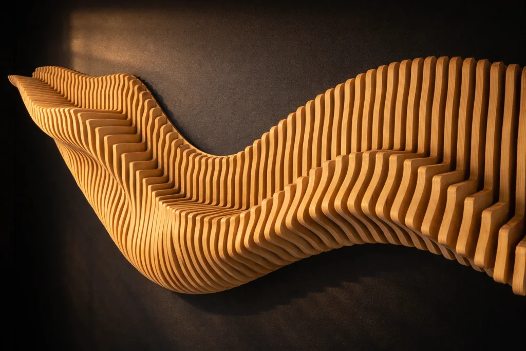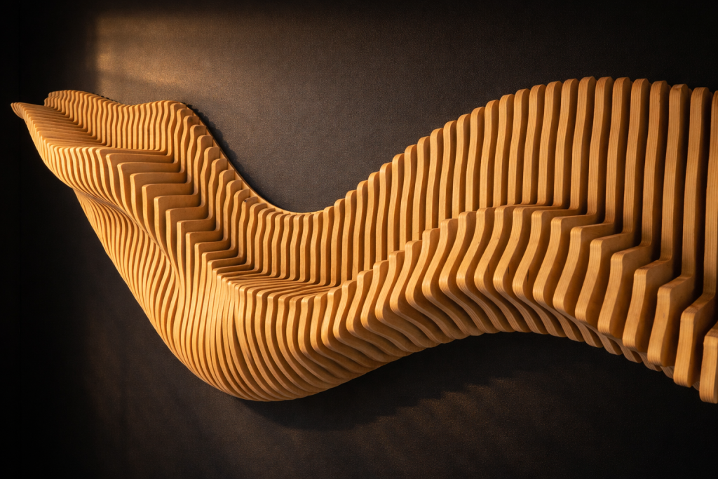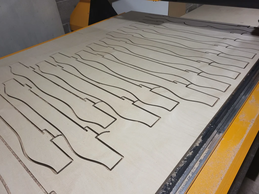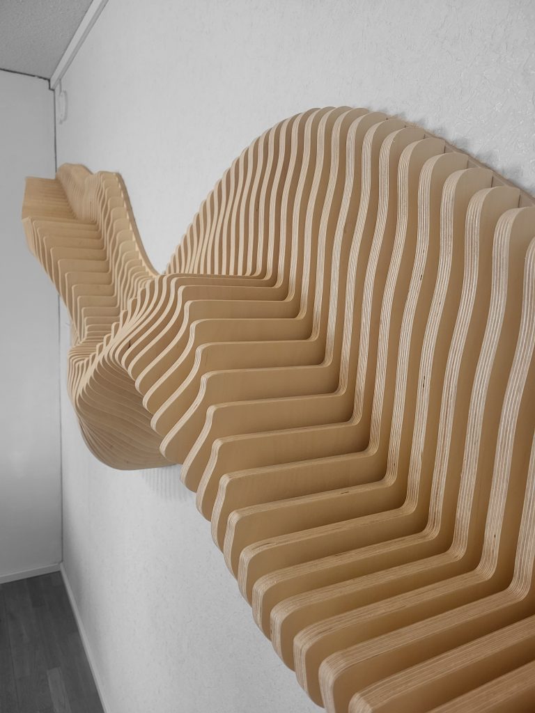 Kun suunnitelma on valmis, malli muunnetaan työstöä varten. CNC-koneemme työstää jokaisen osan tarkasti, ja kun rimat kootaan oikeaan järjestykseen, ne muodostavat alkuperäisen 3D-muodon ➙ Video.