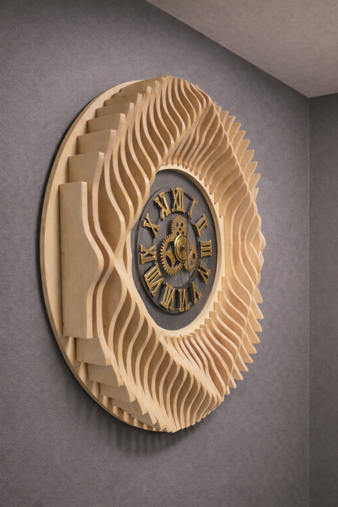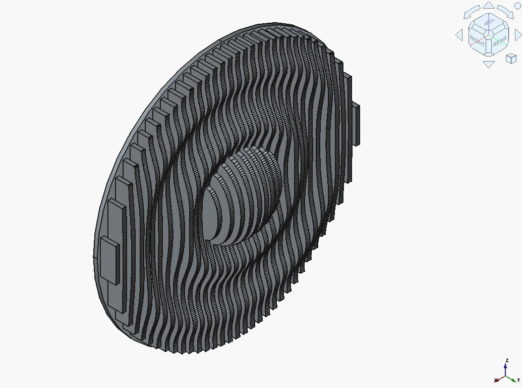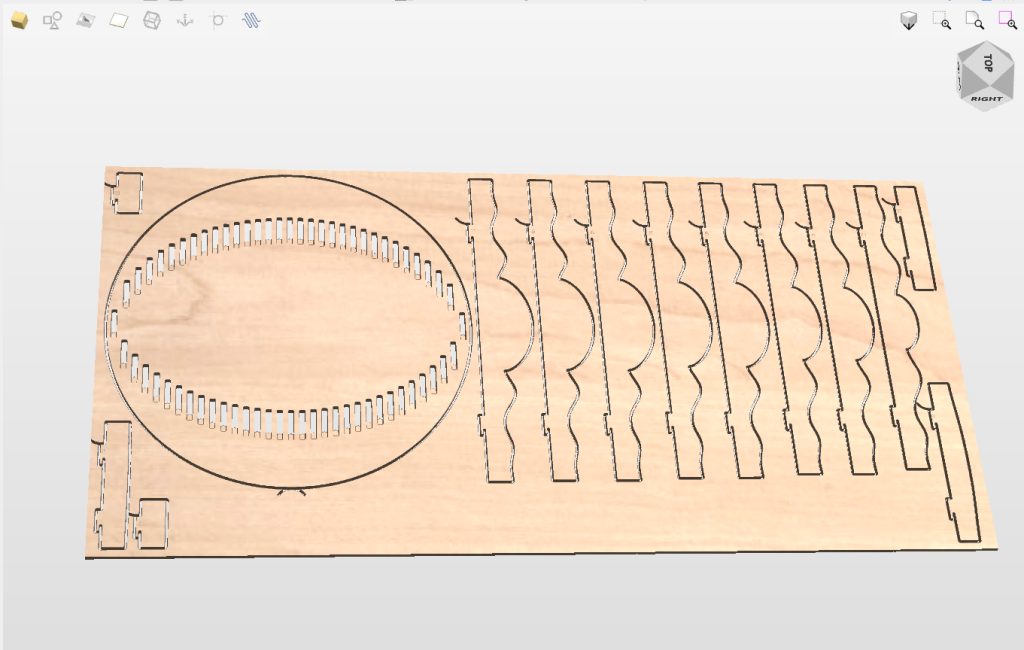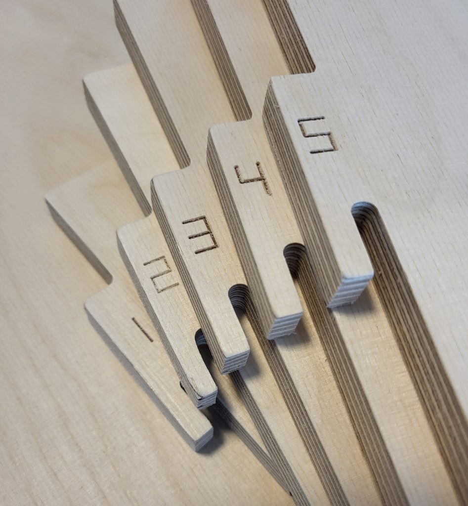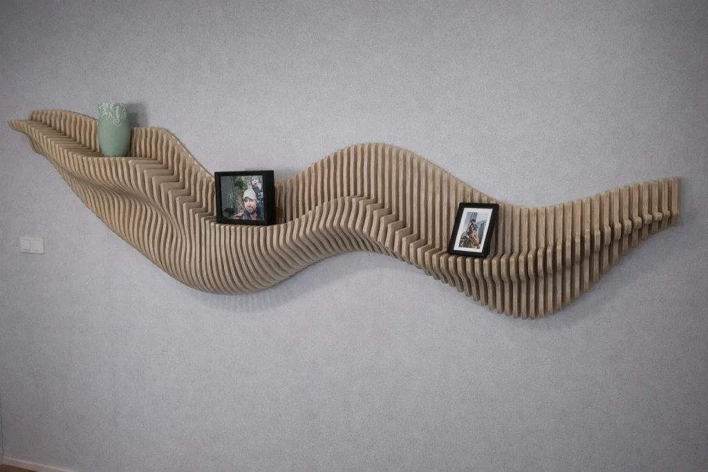 Kun suunnitelma on valmis, malli muunnetaan työstöä varten. CNC-koneemme työstää jokaisen osan tarkasti, ja kun rimat kootaan oikeaan järjestykseen, ne muodostavat alkuperäisen 3D-muodon ➙ Video.