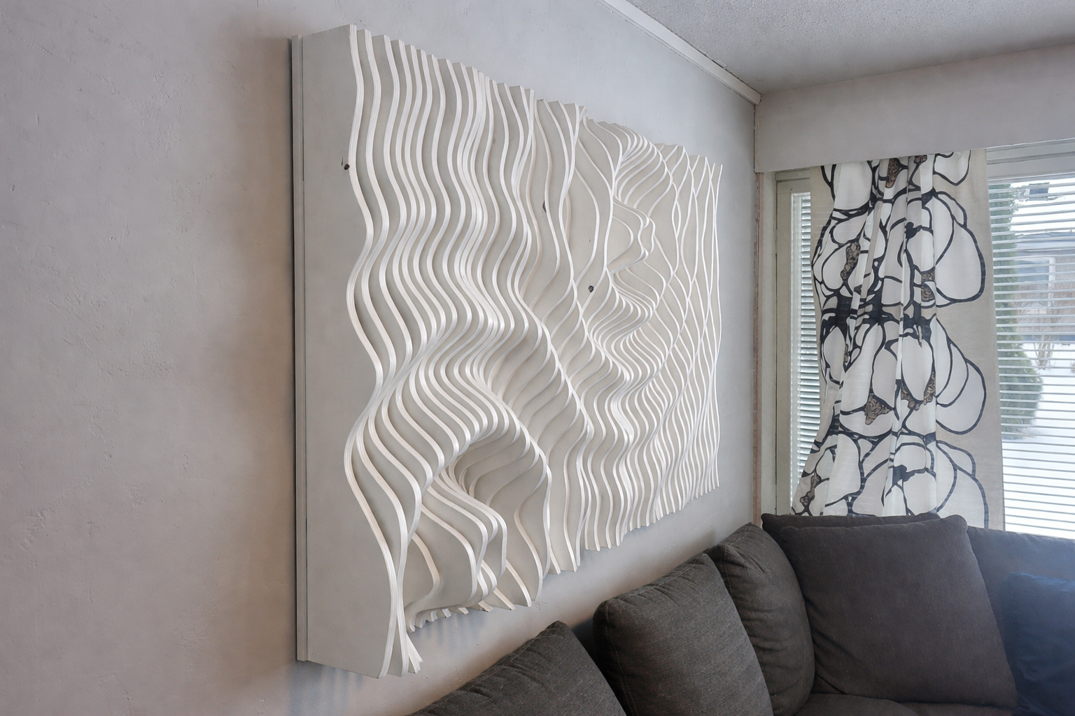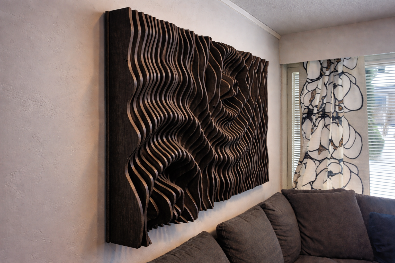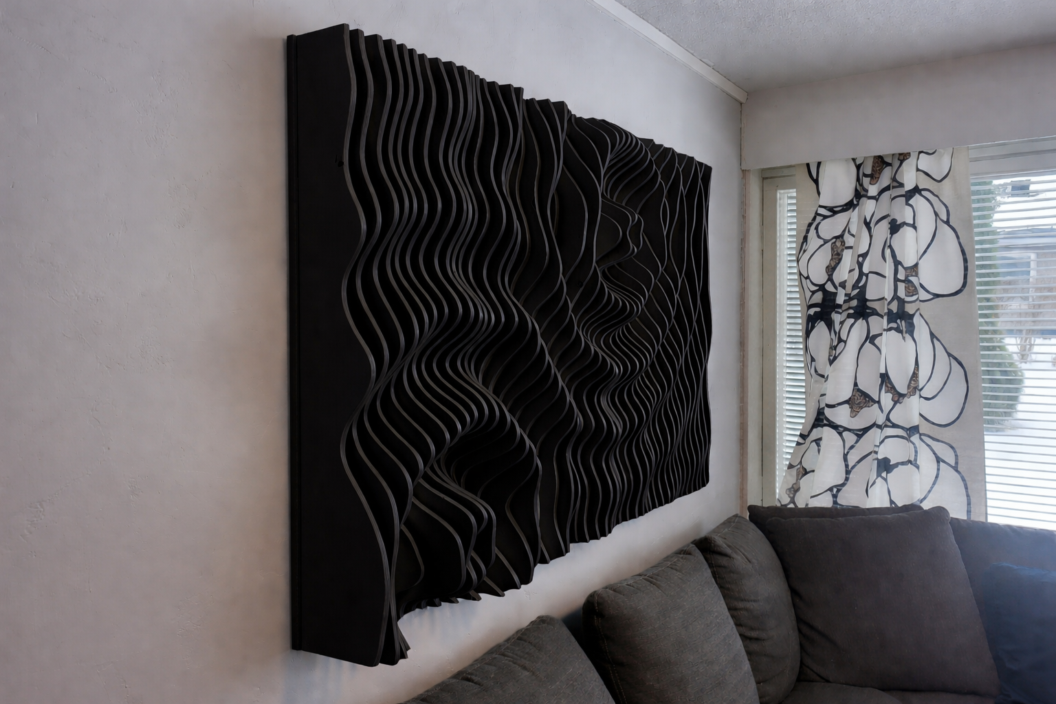 Teos toimii itsenäisenä seinätaideteoksena, mutta samalla rimoitettu rakenne hajottaa ääntä ja pehmentää tilan akustiikkaa.